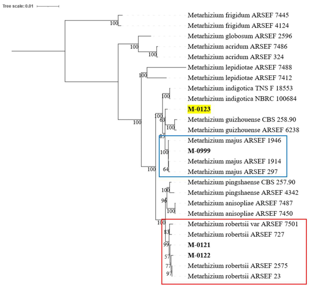 Филогенетическое размещение, установленное на основе семи ДНК-маркеров, использовали для помощи в определении видов четырех изолятов Metarhizium. Анализ сгруппировал M-0121 и M-0122 с четырьмя референсными последовательностями M. robertsii с сильной поддержкой бустрапа (99%, Рисунок 2, указано красной рамкой). Изолят M-0123 был размещен как сестринская ветвь к M. guizhouense, но с поддержкой узла только 63% (Рисунок 2, выделено желтым). Наконец, M-0999 был сгруппирован с тремя изолятами M. majus с достоверностью узла 100% (Рисунок 2, в синей рамке).
