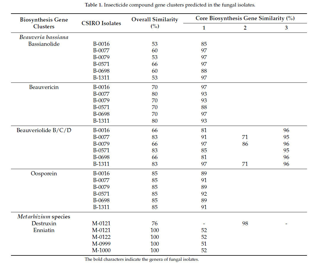 В шести изолятах B. bassiana было распознано 43–51 кластеров генов биосинтеза (BGC), а в пяти изолятах Metarhizium — 56–111. Хотя многие остаются неизвестными, 13–16 BGC из B. bassiana и 24–42 из Metarhizium spp. имеют сходство с референсными кластерами из базы данных MIBiG (Minimum Information about a Biosynthesis Gene cluster). Кластеры, имеющие более 50% сходства с референсными кластерами из базы данных MIBiG, перечислены в Таблице S4.