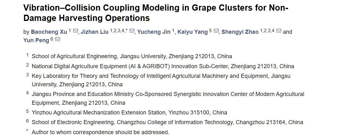 Xu B, Liu J, Jin Y, Yang K, Zhao S, Peng Y. Vibration–Collision Coupling Modeling in Grape Clusters for Non-Damage Harvesting Operations. Agriculture. 2025; 15(2):154. https://doi.org/10.3390/agriculture15020154