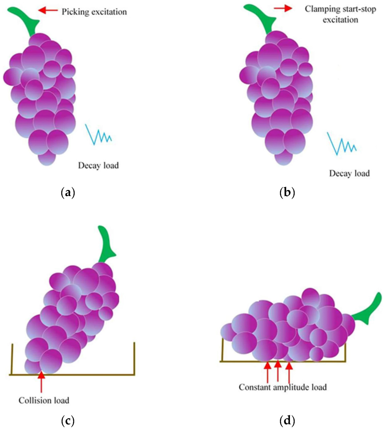 Во время производства столового винограда различные этапы, такие как уборка в поле (включая сбор, транспортировку и укладку) и послепроизводственные мероприятия (такие как сортировка, упаковка и транспортировка), включают значительное механическое обращение. На протяжении процессов сбора и последующего обращения внешние возбуждения генерируют одновременные вибрации и столкновения внутри виноградной грозди. Эти возбуждения могут включать импульсные, сборочные, ударные и периодические возбуждения, которые прикладываются к главной оси и нижним ягодам, как показано на рисунке 1. Каждый тип возбуждения приводит к различному поведению вибрационно-ударного взаимодействия внутри виноградной грозди, что, в свою очередь, приводит к различным реакциям с точки зрения отрыва ягод и повреждения ягод. Чтобы исследовать основные принципы передачи возбуждения и движения вибрационно-ударного взаимодействия в виноградных гроздьях, были проведены пространственно-временные динамические описания и исследования моделирования. Результаты этих симуляций помогают нам лучше понять механизмы, управляющие падением ягоды и повреждением ягоды, предоставляя представление о том, как внешние силы во время обращения влияют на общую целостность виноградной грозди.