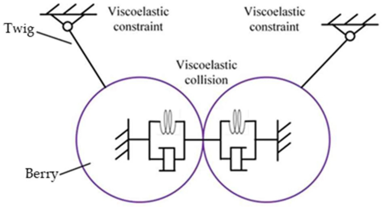 где k4 — эквивалентный коэффициент упругости между двумя ягодами, а c4 — эквивалентный коэффициент демпфирования столкновения между двумя ягодами.