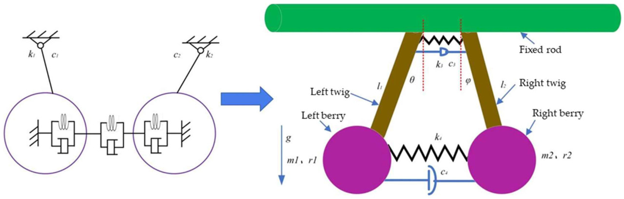 Чтобы установить связанную модель вибрации и столкновения на основе модели столкновения (рисунок 3b), ключевым моментом является интегрировать столкновения ягод в вибрационную модель. Таким образом, сначала была разработана модель вибрационно-ударного взаимодействия системы двойная плодоножка–ягода в условиях ограничения виноградной грозди. Система двойная плодоножка–ягода, наименьшая единица вибрационно-ударного взаимодействия, описывается с помощью модели «(вязкоупругий шарнир)–(жесткий стержень)–(упругий шар)–(вязкоупругая связь)», которая состоит из двух жестких стержней и двух упругих шаров. Вязкоупругий шарнир между стержнями и вязкоупругое столкновение между упругими шарами показаны на рисунке 4.
