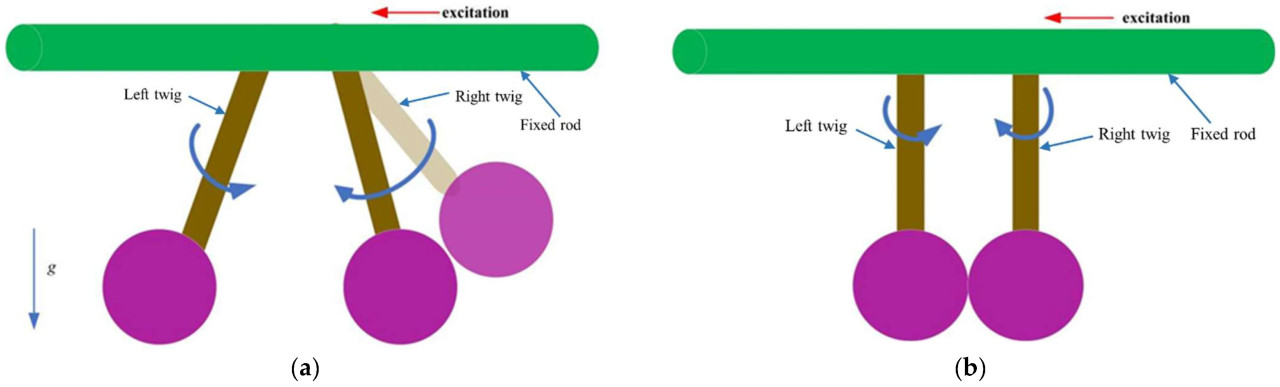 В системе двойная плодоножка–ягода режим вибрации определяется как колебательное движение плодоножек под вязкоупругим ограничением между плодоножкой и фиксированным стержнем, как показано на рисунке 6a. Режим вибрационно-ударного взаимодействия, с другой стороны, является результатом связи между колебательным движением (из-за ограничения вязкоупругого шарнира) и столкновениями ягод (под вязкоупругим контактным ограничением), как показано на рисунке 6b.