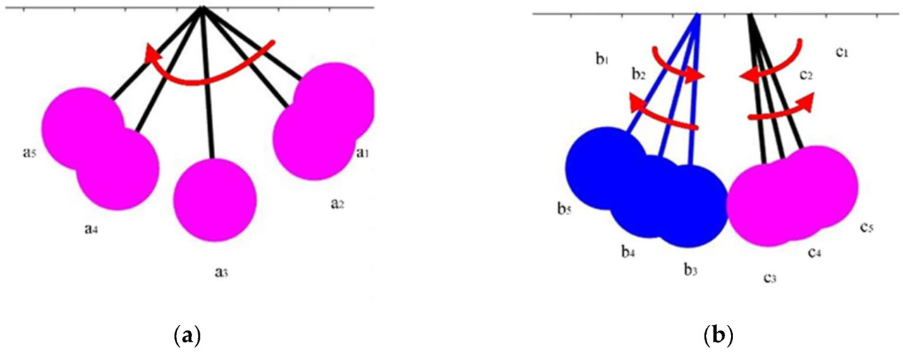 (4) Симуляция несимметричного режима вибрационно-ударного взаимодействия. Чтобы проанализировать влияние начального угла ягод на режим вибрационно-ударного взаимодействия, был разработан тест 9. В тесте 9 количество шагов для всего решения было установлено на 350, и начальный угол левых плодоножек был установлен на −45° в системе двойная плодоножка–ягода. Параметры двух ягод и двух плодоножек были одинаковыми, но начальный угол правой плодоножки был 15°, 30°, 45°, 60° и 75° соответственно в пяти экспериментах теста 9. Гравитационная потенциальная энергия была установлена в качестве внешнего возбуждения для теста 9.
