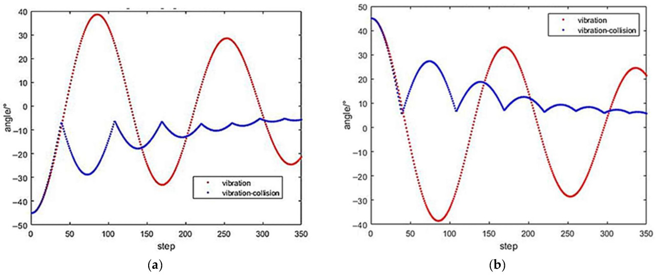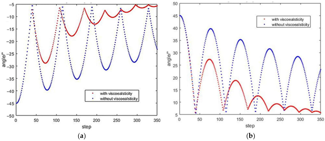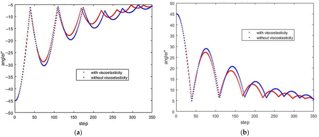 (3) Симуляция для эффекта вязкоупругости на режим вибрационно-ударного взаимодействия. Чтобы изучить влияние вязкоупругости шарниров на режим вибрационно-ударного взаимодействия, были разработаны тест 5 и тест 6. В тесте 5 количество шагов для всего решения было установлено на 350, и начальный угол правых плодоножек был установлен на 45° в системе двойная плодоножка–ягода. Параметры двух ягод и двух плодоножек были одинаковыми. Напротив, тест 6 был контрольным экспериментом, и начальные условия были такими же, как в тесте 5, но не было вязкоупругости в шарнирах. Чтобы проанализировать влияние вязкоупругости ягод на режим вибрационно-ударного взаимодействия, были разработаны тесты 7 и 8. В тесте 7 количество шагов для всего решения было установлено на 350, и начальный угол правых плодоножек был установлен на 45° в системе двойная плодоножка–ягода. Параметры двух ягод и двух плодоножек были одинаковыми. Напротив, тест 8 был контрольным экспериментом, и начальные условия были такими же, как в тесте 7, но не было вязкоупругости ягод. Гравитационная потенциальная энергия была установлена в качестве внешнего возбуждения для тестов 5, 6, 7 и 8.