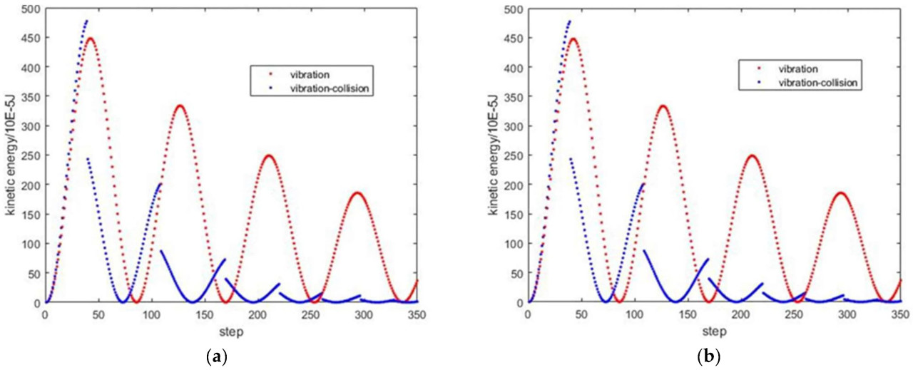 (1) Наблюдая рисунок 11, рисунок 13 и рисунок 14, из-за столкновений ягод в системе двойная плодоножка–ягода, амплитуда вибрации ягоды уменьшена, частота столкновений увеличивается, и потеря механической энергии также возрастает. Следовательно, кинетическая энергия уменьшается до нуля, в то время как угол отклонения и потенциальная энергия уменьшаются периодически, пока не достигнут фиксированного значения. Внезапное падение кинетической энергии во время цикла вибрации-столкновения в основном связано с обменом между кинетической энергией и внутренней энергией во время столкновений, где часть кинетической энергии преобразуется во внутреннюю энергию. В конечном счете, угол отклонения и потенциальная энергия стабилизируются из-за непрерывной потери механической энергии.