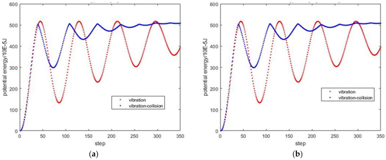 Один из результатов симуляции тестов 3 и 4 показан на рисунке 14, показывая, что потенциальная энергия ягоды в тесте 4 изменяется периодически, причем минимальное значение потенциальной энергии в каждом цикле следует линейному тренду. Напротив, потенциальная энергия в модели вибрационно-ударного взаимодействия показывает периодическое затухание. Период вибрации в тесте 3 короче, чем в тесте 4, но в обоих случаях потенциальная энергия в конечном итоге стабилизируется на фиксированном значении по мере прогресса модели. Общая черта обоих тестов заключается в том, что кривые изменения потенциальной энергии для левой и правой ягод идентичны.