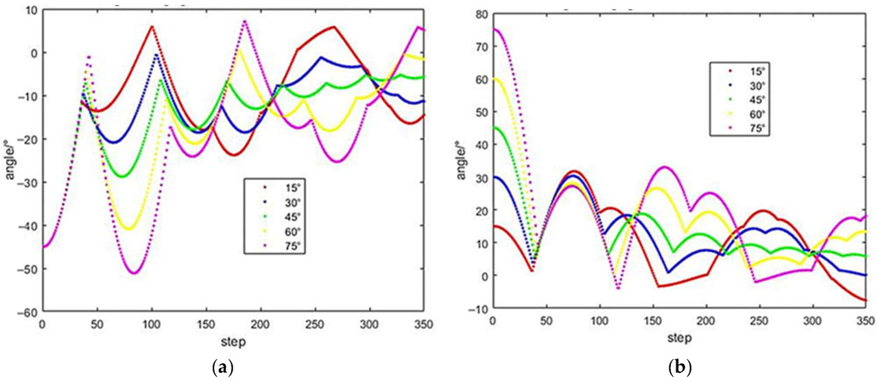 Рисунок 17. Диаграмма, показывающая изменение угла с использованием различных начальных углов для (a) левой и (b) правой ягод.