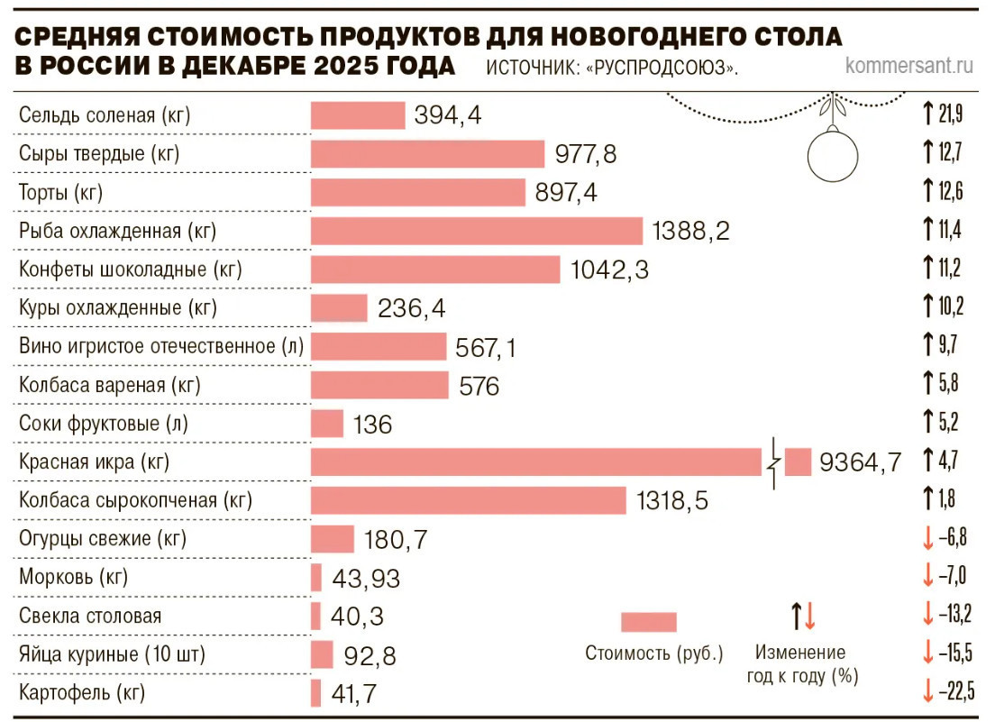 В 2025 году продуктовый набор для новогоднего стола, куда входят ингредиенты для салатов «Оливье», «Селедки под шубой» и одного горячего блюда, подорожал на 6% год к году, против 12% годом ранее. В этот раз стоимость праздничной корзины не росла так быстро за счет того, что благодаря перепроизводству цены на некоторые товары, включая лук, свеклу, картофель, а также яйца, снизились. Зато шпроты подорожали на 26%, а шоколадные конфеты — на 15%, сообщает КоммерсантЪ.
