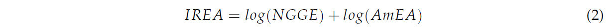 IREA (Индекс сокращенных сельскохозяйственных выбросов), который указывает на эффективность в сокращении сельскохозяйственного загрязнения (более низкие значения индекса отражают эффективное сокращение выбросов загрязняющих веществ от сельского хозяйства). Компоненты: выбросы аммиака (AmEA); и чистые выбросы парниковых газов (NGGE). Формула индекса показана в Уравнении (2):