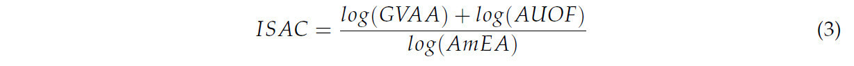 ISAC (Индекс комбинированной сельскохозяйственной устойчивости), который интегрирует экономическую, экологическую эффективность и эффективность исследований (более высокие значения индекса отражают устойчивый экономический рост с высокой долей органического земледелия и низкими выбросами). Компоненты: валовая добавленная стоимость (GVAA); площадь под органическим земледелием (AUOF); и выбросы аммиака (AmEA). Формула индекса показана в Уравнении (3):