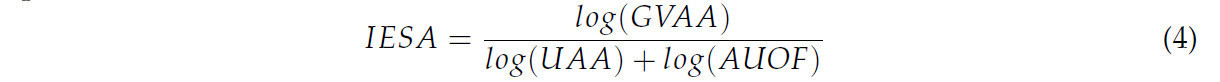 IESA (Индекс эффективности использования сельскохозяйственных площадей), который оптимизирует использование площадей для экономической эффективности и устойчивости (увеличивающиеся значения индекса отражают эффективное использование сельскохозяйственных площадей для экономического производства). Компоненты: используемая сельскохозяйственная площадь (UAA); валовая добавленная стоимость (GVAA); и площадь под органическим земледелием (AUOF). Формула индекса показана в Уравнении (4):