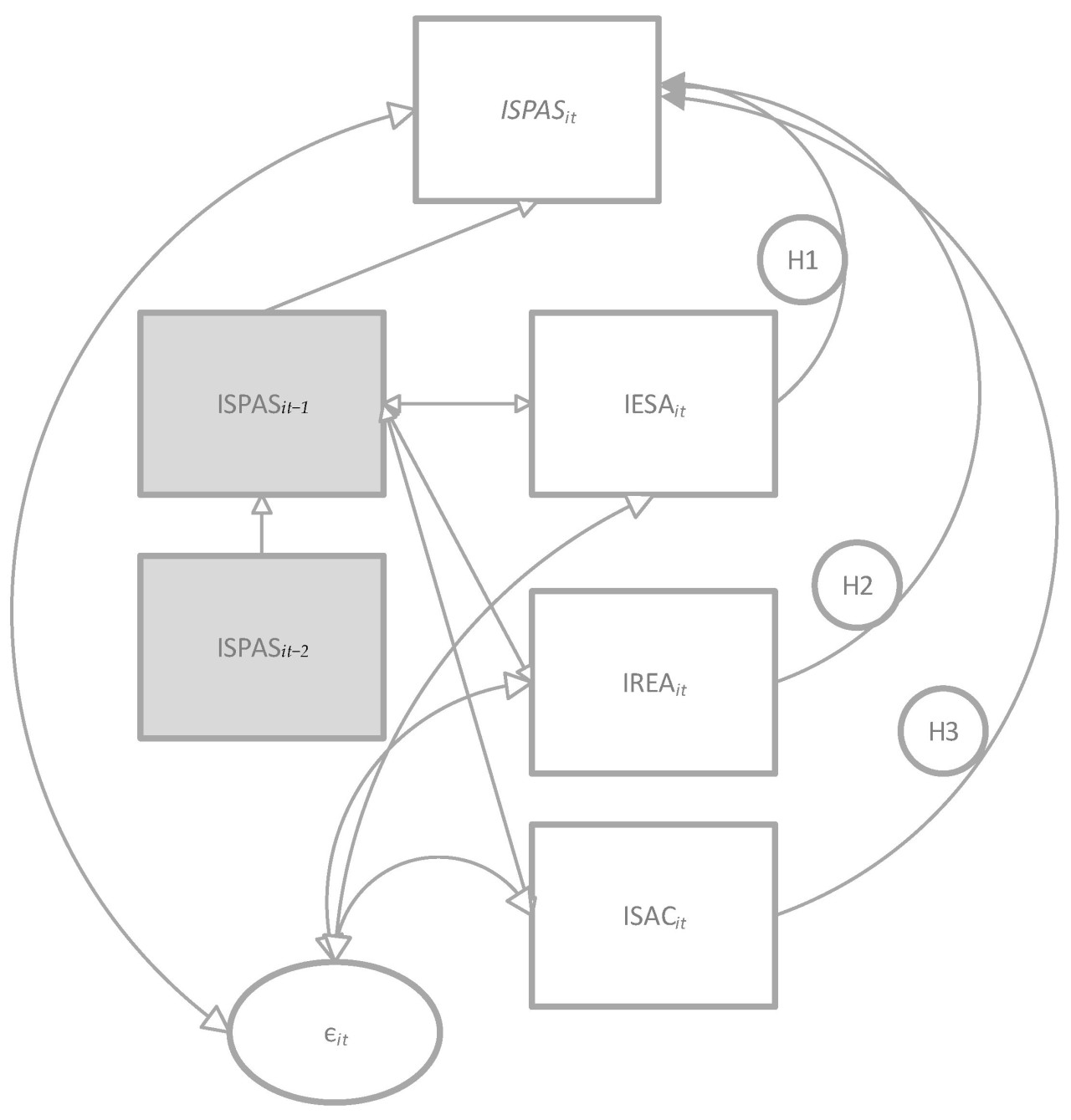 Рисунок 1. Логическая схема исследования (единица i во время t). Серая зона = динамические компоненты (время t, t − 1, t − 2) Источник подготовлен авторами.