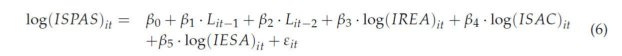 Модель оценки динамической панели Арелляно-Бонда анализирует взаимосвязи в панельных наборах данных, где запаздывающие зависимые переменные включены как регрессоры. Устойчивость сельскохозяйственной эффективности анализируется в разных регионах (DMU-ЕС27, кроме Мальты и Люксембурга) за период 2012–2022 гг., используя композитные индикаторы (ISPAS, IREA, ISAC и IESA), полученные из экономических и экологических метрик. Эта методология ценна для оценки устойчивости сельского хозяйства, поскольку учитывает ненаблюдаемую неоднородность, эндогенность и динамические взаимосвязи с течением времени. Уравнение модели может быть определено следующим образом: