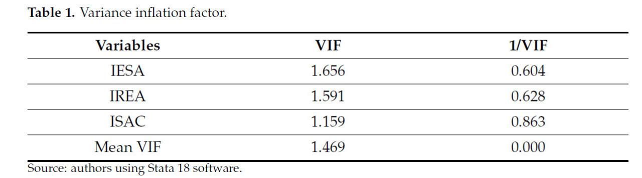 Согласно данным в Таблице 1, значения VIF для всех переменных значительно ниже критического порога 10, указывая на отсутствие мультиколлинеарности в модели. Независимые переменные (IESA, IREA и ISAC) подходят для использования в регрессионной модели, и их коэффициенты могут интерпретироваться с уверенностью.