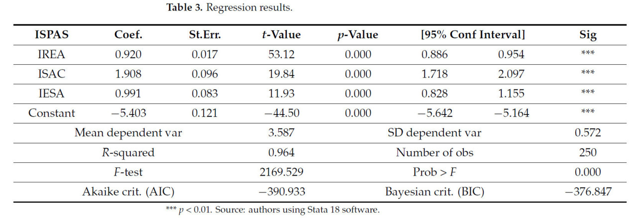 Применяя модель множественной линейной регрессии к индикаторам устойчивости сельского хозяйства (ISPAS, IREA, ISAC и IESA), мы смогли сосредоточиться на корреляционных взаимосвязях между индикаторами, состоящими из эффективности и устойчивости европейского сельского хозяйства. В модели объясняющие переменные — IREA (сокращение выбросов), ISAC (комбинированная устойчивость) и IESA (эффективность сельскохозяйственных земель) оцениваются, чтобы понять их влияние на ISPAS (Индекс устойчивых сельскохозяйственных показателей). ASM таким образом позволяет точный анализ того, как эффективность использования земель, сокращение выбросов и интеграция экономической и экологической устойчивости влияют на сельскохозяйственную эффективность. Модель предоставляет надежную и объективную оценку детерминант устойчивости сельского хозяйства, предоставляя соответствующую поддержку для реализации политики Зеленого курса в европейском сельском хозяйстве. Уравнение модели может быть определено следующим образом:
