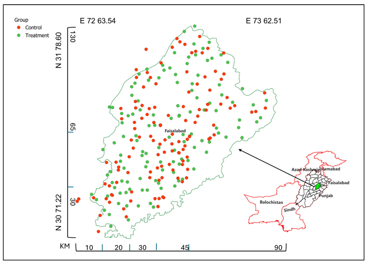 Общая площадь округа Фейсалабар составляет 5856 квадратных километров. Территория мероприятия была распределена между долготой 73° и 72° восточной и широтой 30° и 31.9° северной. Местоположение каждой обработанной фермы было зафиксировано отделом распространения знаний во время мероприятия, тогда как контрольная группа была зафиксирована группой обследования во время сбора данных, как показано на Рисунке 2. Фермеры в обеих группах не имеют общих границ своих сельскохозяйственных угодий, так как они расположены очень далеко друг от друга. Кратчайшее расстояние между двумя ближайшими точками (контроля и мероприятия) составляло 2 км. Вероятность эффекта перелива во время мероприятия была меньше из-за анонимности мероприятия, а также незнакомства фермеров друг с другом, поскольку каждый был из другой деревни.