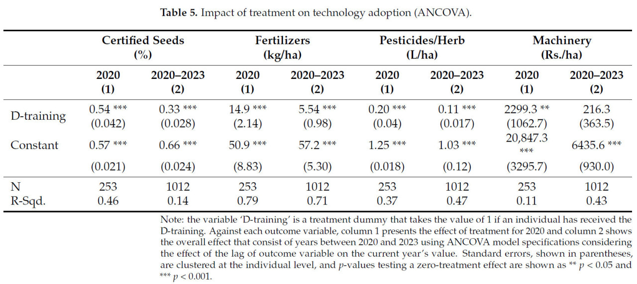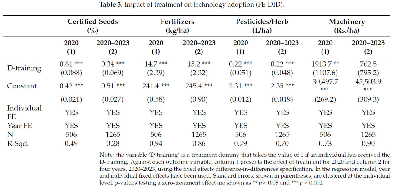 Приводят ли интенсивные демонстрации к стабильному внедрению технологий и повышению урожайности? Хотя методы распространения знаний показывают значительный непосредственный эффект от вмешательства, их влияние может со временем ослабевать. В рамках государственного естественного эксперимента в Пакистане, с использованием метода "разность-разностей" с фиксированными эффектами на панельных данных, наблюдалось долгосрочное внедрение сертифицированных семян, удобрений и пестицидов/гербицидов в течение нескольких лет после мероприятия.