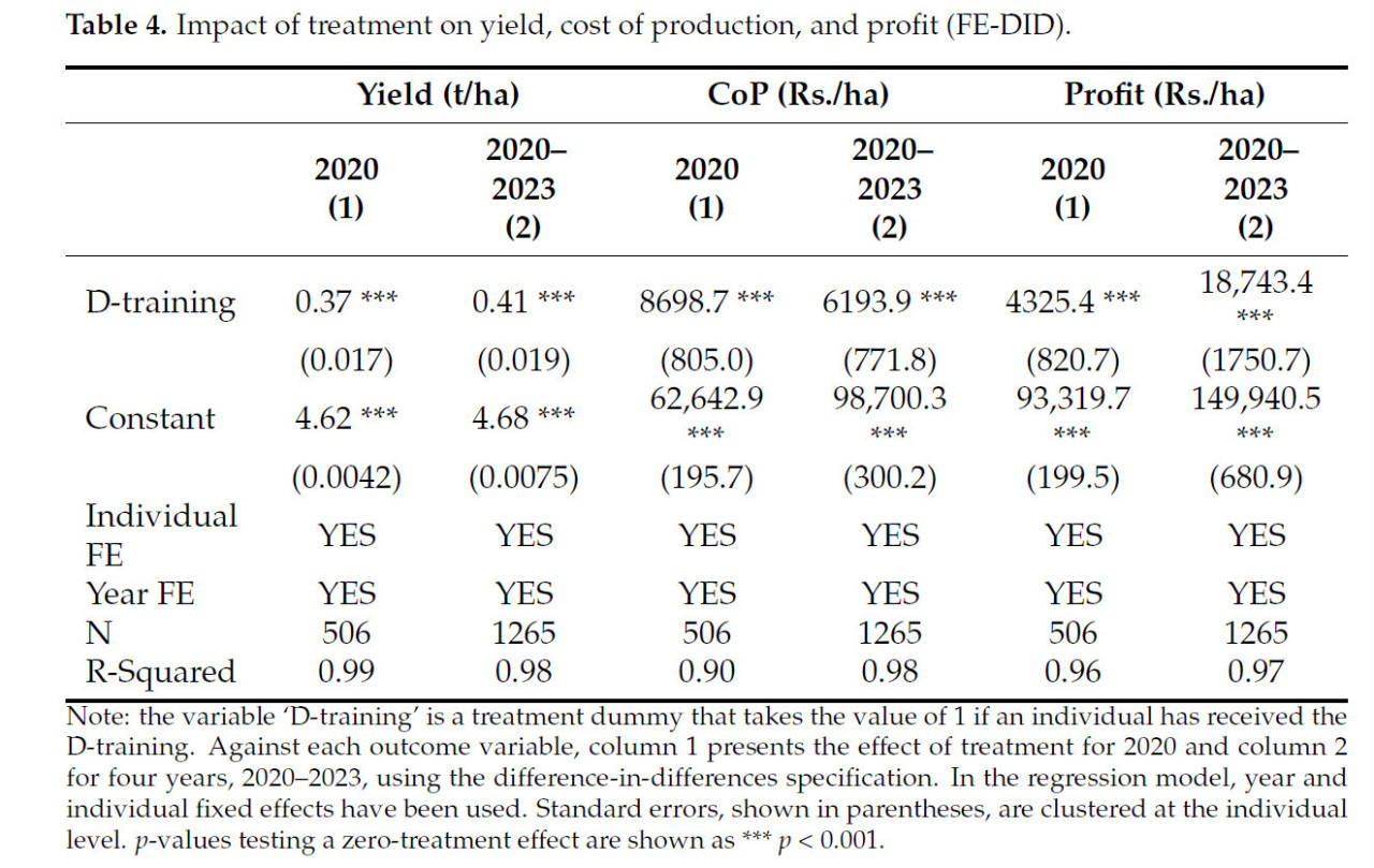 Таблица 3 представляет результаты оценки FE-DID воздействия мероприятия на технологические ресурсы, т.е. сертифицированные семена, удобрения, пестициды/гербициды и использование техники. Столбец 1 представляет непосредственный эффект мероприятия, а столбец 2 представляет среднее значение за 2020–2023 гг. Все обработанные фермеры использовали сертифицированные семена в первый год мероприятия, что отражает увеличение на 61% от исходного уровня, тогда как среднее использование было обнаружено увеличенным на 34% в течение 2020–2023 гг. Точно так же количество удобрений и пестицидов/гербицидов увеличилось на 14,7 кг/га и 0,22 л/га соответственно в группе мероприятия в 2020 году. Эффект мероприятия оставался стабильным и значительным в течение 2020–2023 гг. по обоим ресурсам. Однако использование техники с точки зрения затрат было значительным в 2020 году на уровне значимости 5% и позже оказалось незначительным, изображая равное использование техники обеими группами.