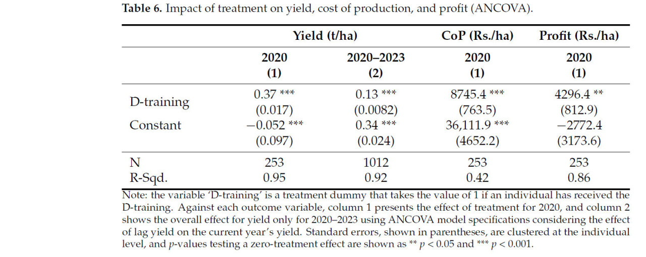 ANCOVA использовалась для проверки устойчивости и анализа чувствительности путем взятия лага зависимых переменных, таких как лаг урожайности, в качестве добавленной ковариаты в дополнение к переменной мероприятия (Таблицы 5 и 6). Например, урожайность предыдущего года имеет наибольшую корреляцию с переменной результата (урожайность следующего года). Коэффициенты сертифицированных семян, удобрений, пестицидов/гербицидов и урожайности в ANCOVA аналогичны моделям FE-DID, показывая устойчивый результат мероприятия. Влияние D-обучения ослабло в последующие годы, но константа показала улучшенный коэффициент, как показано в столбце 2 Таблицы 5. Коэффициенты и поведение финансовых коэффициентов также оказались схожими с нашими основными результатами для непосредственного пост-мероприятийного года. Однако для долгосрочного воздействия литература не рекомендует использовать ANCOVA для панельных или последующих данных [58,59]. Большинством исследователей рекомендовалась модель фиксированных эффектов для панельных данных [55,60,61]. Поэтому мы сообщаем только результаты за первый пост-мероприятийный год с использованием ANCOVA для стоимости производства и прибыли, которые аналогичны нашим основным результатам, как показано в Таблице 6. Отрицательные точки пересечения в Таблице 6 показывают силу мероприятия, так как в его отсутствие была бы меньшая урожайность и денежные потери на основе урожайности предыдущего года.