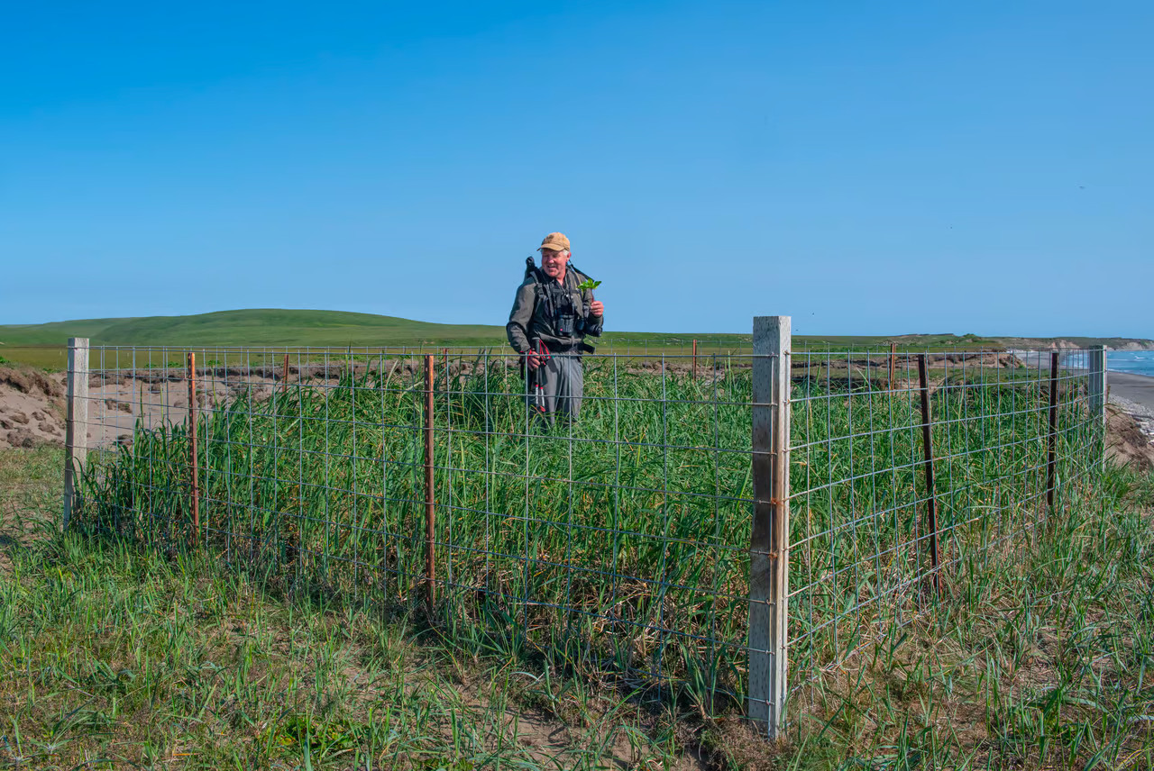 Неподалеку находится проволочное ограждение, одно из пяти, установленных Эббертом и его коллегами в 2016 году. Ограждение — достаточно большое, чтобы припарковать квадроцикл — не пропускает скот, позволяя восстановиться неповрежденному участку земли. Внутри ограждения возвышается рожь, высота которой превышает рост коров. Вот как выглядит остров без скота: убежище для гнездящихся на земле птиц. Народ алутиик полагался на рожь, используя ее волокно для кровельных работ, изготовления корзин, носков и других текстильных изделий; если они и завозили сусликов, то знали, что делают, поскольку грызуны не сильно изменяли растительность, как это делают коровы.