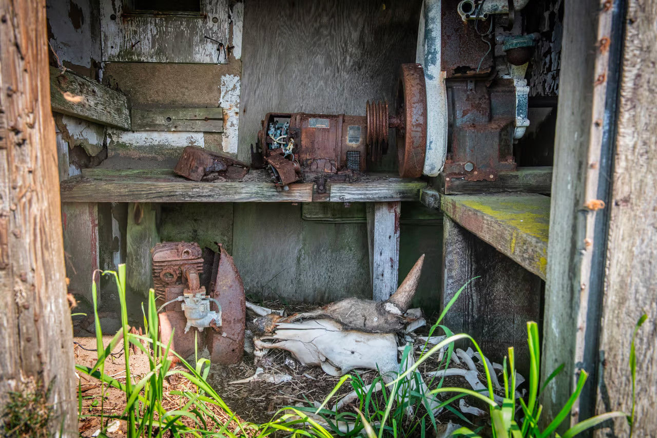 На полу лежит коровья голова, напоминающая маску на Хэллоуин: рога подняты вверх, глазницы обращены к двери, рыло прижато к чему-то, похожему на ржавый двигатель. Половина головы состоит из костей, половина покрыта шкурой и кератином. Бедренные кости, ребра и позвоночник разбросаны по полу среди обломков механизмов. Однажды, по неизвестным причинам, эта корова застряла в старом сарае и умерла.