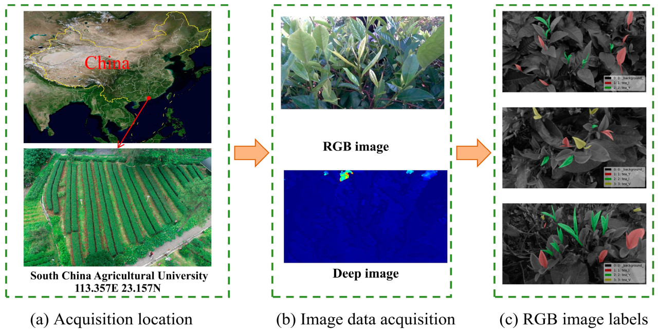 Данное исследование сосредоточено на сорте Yinghong No. 9, данные изображений были собраны в естественной среде в Южно-Китайском сельскохозяйственном университете в Гуанчжоу, провинция Гуандун, Китай. Из-за сложного фона в чайных садах внешний вид изображений чайных почек различается при разных углах обзора. Чтобы повысить надежность и обобщаемость визуальной модели, предложенной в этом исследовании, был проведен эксперимент по сбору данных изображений с нескольких углов с использованием камеры глубины Intel RealSense D405. Были захвачены несколько RGB и глубинных изображений с различных углов. RGB-изображения использовались для распознавания визуальной моделью, в то время как глубинные изображения предоставляли 3D-информацию для оценки позы чайных почек. Набор данных состоит из 1434 исходных RGB-изображений, которые были размечены с помощью программного обеспечения LabelMe (https://github.com/labelmeai/labelme, доступ осуществлен 17 августа 2023 г.). Информация о метках хранится в формате "json". В процессе маркировки применялся подход "одна почка - один лист", с метками "tea_Y", "tea_I" и "tea_V", назначенными для представления трех различных форм чайных почек в поле зрения камеры. В частности, "tea_Y" указывает, что чайная почка, чайный лист и стебель хорошо видны; "tea_I" указывает, что чайная почка и чайный лист перекрываются под заданным углом, а стебель хорошо виден; "tea_V" указывает, что чайная почка и чайный лист хорошо видны, а стебель закрыт. Среда чайного сада для сбора данных и размеченные RGB-изображения показаны на Рисунке 2.
