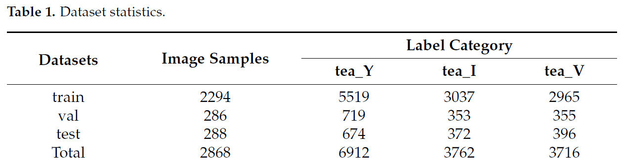 В неструктурированных условиях чайного сада различия в условиях освещения и разнообразная морфология чайных почек представляют значительные трудности для точного распознавания чайных почек визуальной системой. Чтобы решить эти задачи и повысить надежность модели визуального распознавания, к исходному набору данных были применены методы аугментации данных, такие как отражение, корректировка контраста и изменение насыщенности. Это привело к общему количеству 2868 RGB-изображений. Статистика набора данных показана в Таблице 1. Набор данных включает 6912 образцов, помеченных как "tea_Y", 3762 образца, помеченных как "tea_I", и 3716 образцов, помеченных как "tea_I". Набор данных был разделен на обучающую, проверочную и тестовую выборки в соотношении 8:1:1.