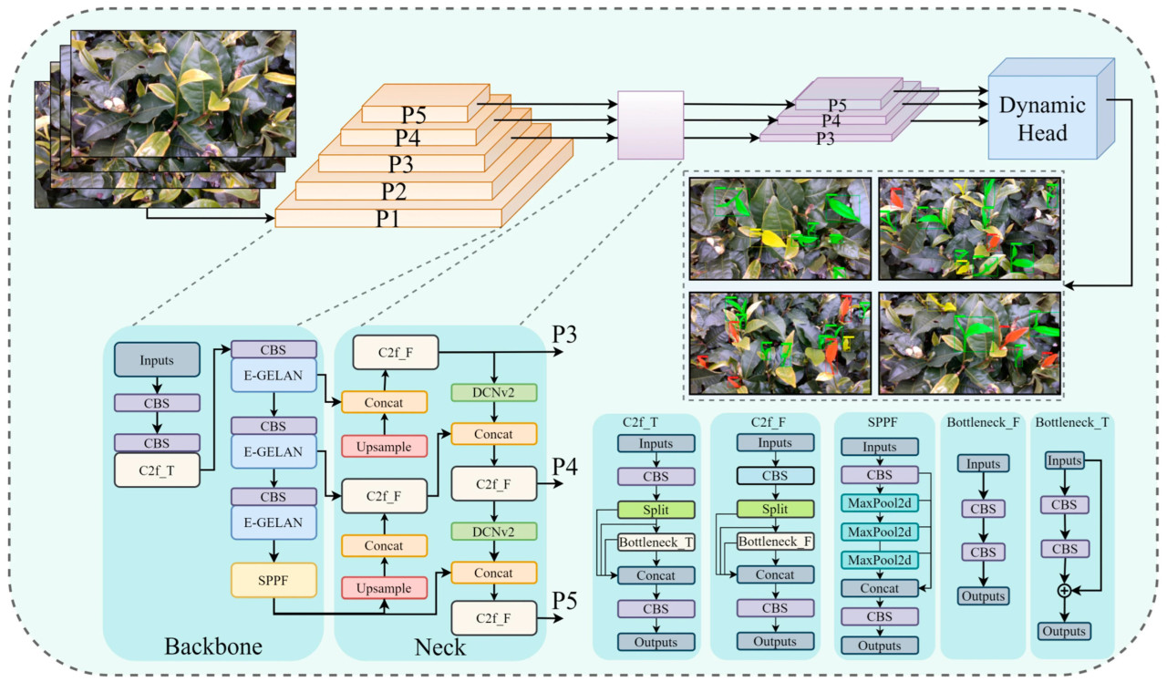 (i) Модуль E-GELAN создан и интегрирован в Backbone для извлечения признаков, превосходно захватывая детализированные морфологические признаки и контекстную информацию чайных почек.