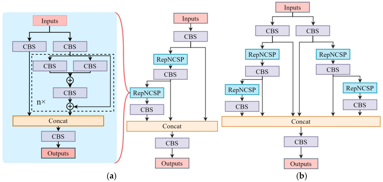 Рисунок 4. Модули GELAN и E-GELAN. (a) Модуль GELAN; (b) Модуль E-GELAN.