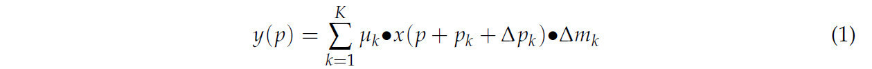 где 𝑝 представляет позицию в карте признаков, 𝜇𝑘 представляет вес в позиции выборки, а Δ𝑝𝑘 и Δ𝑚𝑘 представляют обучаемое смещение и масштабирующий коэффициент модуляции в позиции выборки соответственно. Δ𝑝𝑘 — неограниченное действительное число, в то время как Δ𝑚𝑘∈[0,1].