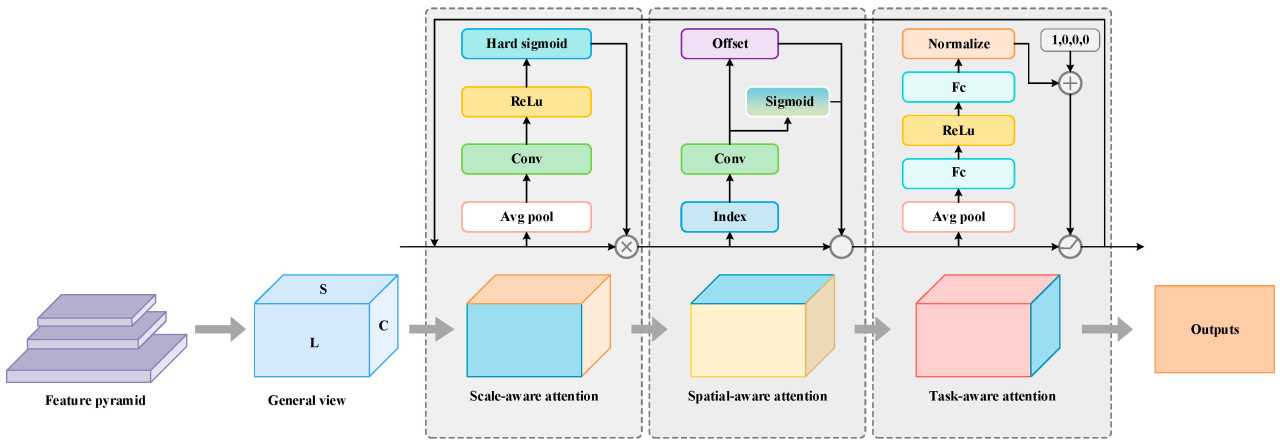 Dynamic Head получает выходы от различных уровней Neck и выполняет увеличение или уменьшение масштаба для унификации масштаба, создавая 4-мерный тензор 𝐹∈𝑅𝐿×𝐻×𝑊×𝐶. Если выразить как 𝑆=𝐻×𝑊, выход представляет собой 3-мерный тензор 𝐹∈𝑅𝐿×𝑆×𝐶. Dynamic Head применяет механизмы внимания к различным измерениям, с конкретными расчетами, показанными в Уравнении (2).