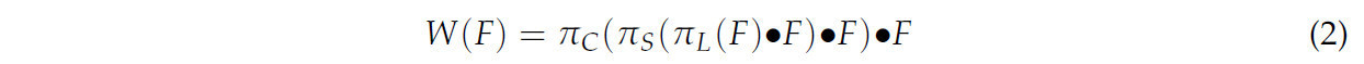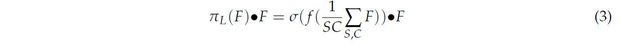 где 𝜋𝐿, 𝜋𝑆 и 𝜋𝐶 представляют модули внимания для трех различных измерений: L, S и C соответственно. Модуль внимания к масштабу 𝜋𝐿 используется для слияния признаков в различных масштабах на карте признаков, модуль пространственного внимания 𝜋𝑆 повышает способность модели различать пространственное положение, а модуль внимания к задаче 𝜋𝐶 динамически активируется в соответствии с конкретной задачей. Их выражения даны следующим уравнением: