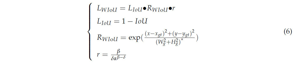 где 𝐿𝐼𝑜𝑈 представляет традиционную функцию потерь IoU, и меньшее значение указывает на лучшую производительность предсказания модели. 𝑅𝑊𝐼𝑜𝑈 обозначает функцию метрики расстояния между предсказанными и истинными ограничивающими рамками. 𝑥, 𝑦, 𝑥𝑔𝑡, и 𝑦𝑔𝑡 представляют координаты предсказанной и истинной рамок, в то время как 𝑊𝑔 и 𝐻𝑔 обозначают ширину и высоту минимального ограничивающего прямоугольника для предсказанной и истинной рамок соответственно. (𝑊2𝑔+𝐻2𝑔)∗ представляет коэффициент нормализации, обеспечивая, чтобы результаты не зависели от размера ограничивающего прямоугольника. 𝑟 относится к усилению градиента, а 𝛽 обозначает степень выброса. 𝛼 и 𝛿 являются гиперпараметрами.