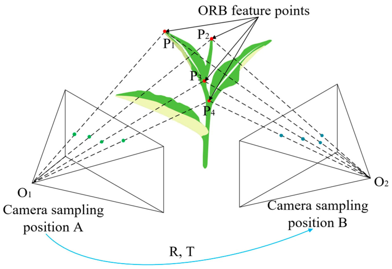 В процессе построения полной формы чайных почек с использованием RGB-D камеры возникают значительные трудности из-за расхождений между RGB-изображениями и глубинными изображениями, полученными при однопозиционной съемке. В результате необходимо комбинировать облака точек из многопозиционной съемки для создания всестороннего 3D-представления цели [35]. Визуальная одновременная локализация и картографирование (VSLAM) — это технология, которая позволяет в реальном времени оценивать как 3D-структуру среды, так и положение камеры. ORBSLAM3 [36], продвинутый алгоритм VSLAM, работает исключительно хорошо в сложных условиях, обнаруживая и сопоставляя ORB-особые точки для извлечения ключевых точек из поля зрения и используя методы оптимизации графа для построения плотных облаков точек. В этом исследовании ORBSLAM3 используется для оценки положения камеры в реальном времени, получения матрицы вращения R и матрицы трансляции T, как показано на Рисунке 7. Затем глубинное изображение преобразуется в 3D облако точек с использованием внутренних параметров камеры. Используя матрицу вращения R и матрицу трансляции T из многопозиционной съемки, 3D облака точек из этих различных позиций точно выравниваются для генерации глобального, плотного облака точек цели. Наконец, выходная маска модели сегментации экземпляров используется для определения целевой области, извлекая локальное облако точек, представляющее полную форму чайных почек.