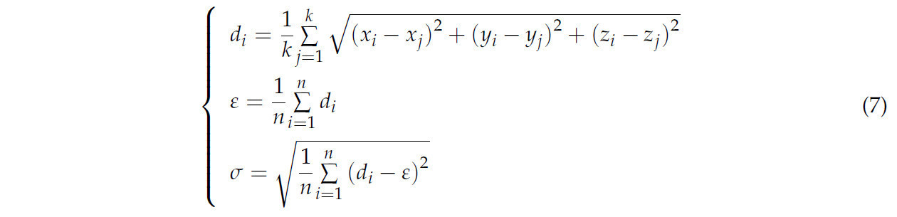 Плотные облака точек предоставляют более точное представление морфологических признаков чайных почек. Однако из-за таких факторов окружающей среды, как ограничения камеры, локальные облака точек чайных почек могут содержать шум и выбросы, что может влиять на точность и скорость оценки позы. Следовательно, фильтрация и понижающая дискретизация полученных облаков точек чайных почек являются ключевыми этапами в процессе оценки позы. Статистическая фильтрация выбросов (SOR) — это эффективный метод удаления выбросов. Этот подход вычисляет среднее расстояние между каждой точкой и ее соседними точками, а также глобальное стандартное отклонение расстояний, чтобы определить, является ли точка выбросом. Конкретно, для набора облаков точек чайных почек {T1,T2,…,Tn}, среднее расстояние целевого облака точек до его соседних точек и глобальное стандартное отклонение расстояний вычисляются следующим образом: