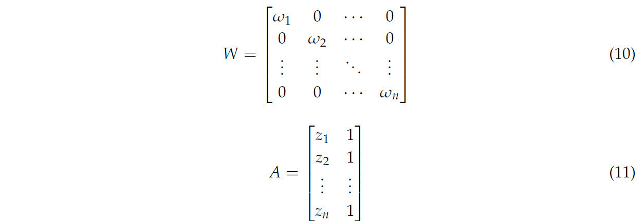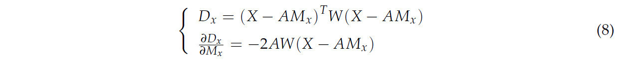 где 𝐷𝑥 и 𝐷𝑦 представляют целевые функции для аппроксимации набора облаков точек вдоль осей X и Y соответственно. 𝑀𝑥=[𝑎𝑥,𝑏𝑥]𝑇 и 𝑀𝑦=[𝑎𝑦,𝑏𝑦]𝑇 — параметры линий, аппроксимированных вдоль осей X и Y. ∂𝐷𝑥∂𝑀𝑥 и ∂𝐷𝑦∂𝑀𝑦 обозначают частные производные, и оптимальные значения 𝑀𝑥 и 𝑀𝑦 могут быть получены путем решения этого уравнения, когда частные производные установлены в ноль. 𝑋=[𝑥1,𝑥2,⋯𝑥𝑛]𝑇 и 𝑌=[𝑦1,𝑦2,⋯𝑦𝑛]𝑇 представляют векторы осей X и Y набора облаков точек P. 𝑊 — весовая матрица, а 𝐴 — матрица плана. Их выражения даны следующим уравнением: