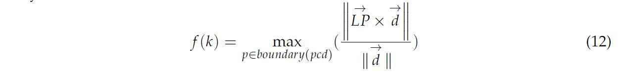 где 𝑏𝑜𝑢𝑛𝑑𝑎𝑡𝑦(𝑝𝑐𝑑) представляет граничный набор точек предварительно обработанного облака точек чайных почек, в то время как 𝑃 обозначает облако точек признаков на этом наборе. 𝐿 и 𝑑→ относятся к любой точке и вектору направления вдоль главной оси облака точек чайных почек соответственно.