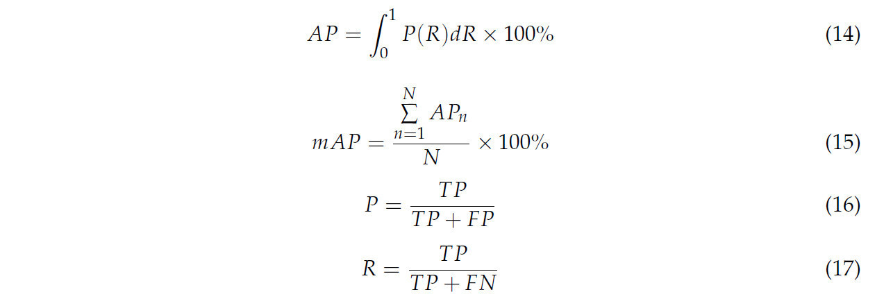 Производительность модели много-морфологической сегментации чайных почек ключевая для последующей оценки позы. В этом исследовании Средняя Точность (AP) и Средняя Средняя Точность (mAP) используются для оценки производительности модели много-морфологической сегментации чайных почек. AP — это обычно используемая метрика в сегментации экземпляров, состоящая из точности и полноты, которая отражает общую производительность распознавания для конкретного класса. mAP — это среднее значений AP в различных классах, предоставляя всестороннюю меру производительности распознавания модели для всех целей. Их конкретные формы даны следующими уравнениями: