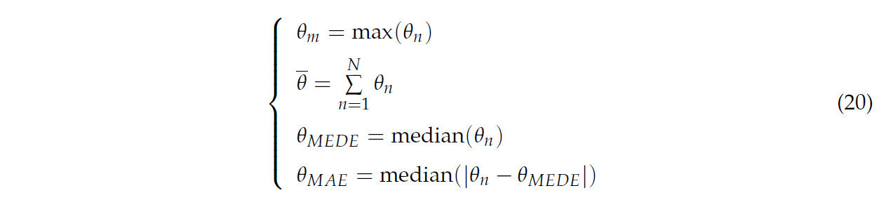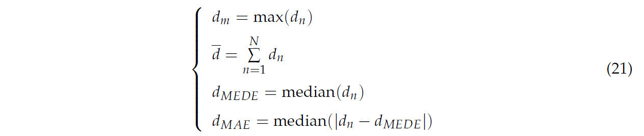 где 𝜃𝑚, 𝑑𝑚, 𝜃̲, 𝑑̲, 𝜃𝑀𝐸𝐷𝐸, 𝑑𝑀𝐸𝐷𝐸, 𝜃𝑀𝐴𝐸 и 𝑑𝑀𝐴𝐸 представляют максимальную ошибку, среднюю ошибку, медианную ошибку и медианное абсолютное отклонение угловых и дистанционных ошибок соответственно.