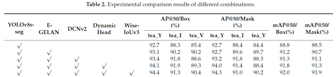 (i) Модель сегментации экземпляров чайных почек основана на модели YOLOv8s-seg. Путем оптимизации Backbone, Neck, Head и функций потерь, mAP@50 для box и mask были улучшены до 92,0% и 91,9% соответственно, показывая улучшения на 3,2% и 3,4% по сравнению с исходной моделью. Этот результат демонстрирует надежность предложенной модели сегментации экземпляров для сегментации чайных почек в неструктурированных условиях.