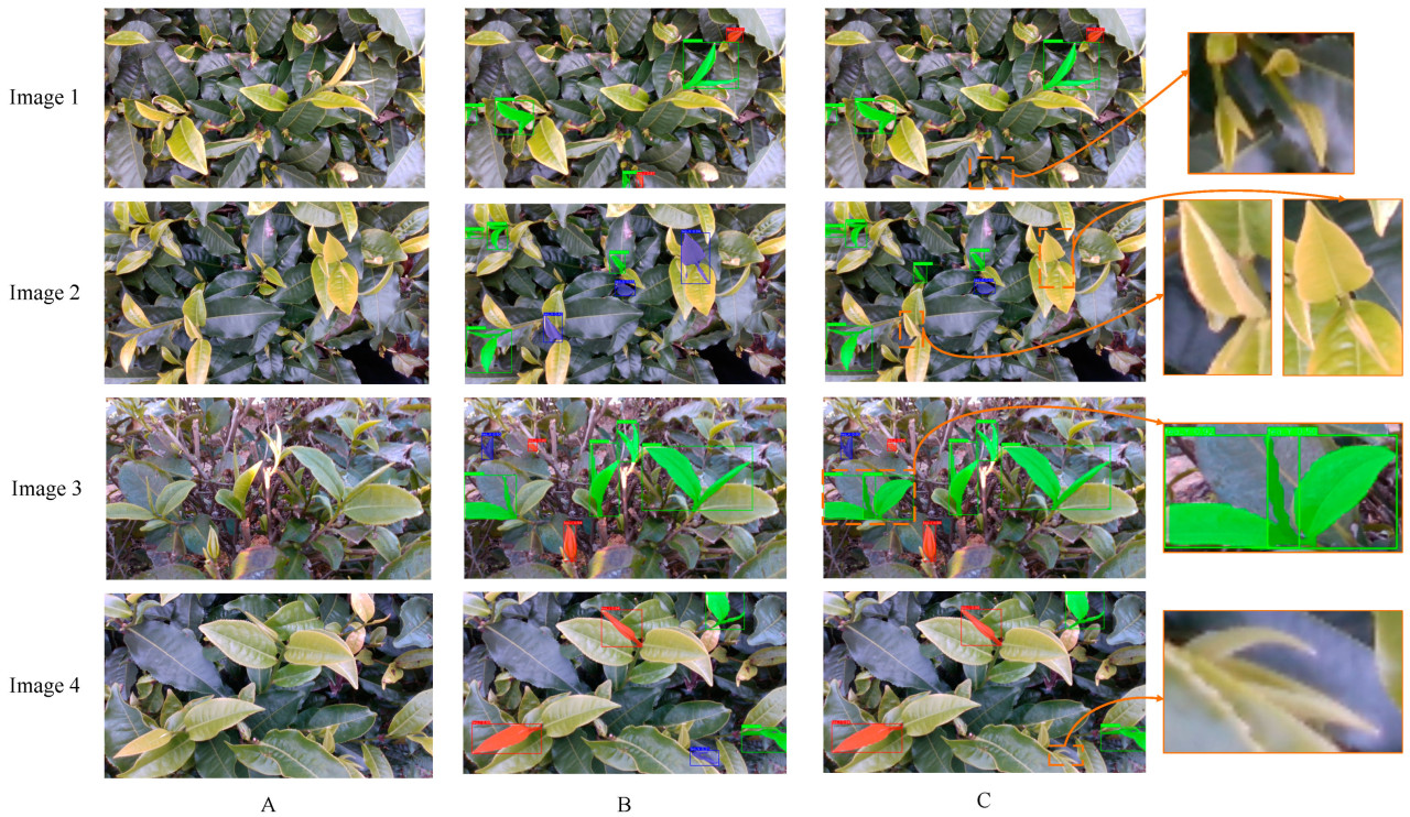 Рисунок 9. Результаты сегментации экземпляров чайных почек. (A) Исходное изображение, (B) предложенная модель сегментации экземпляров, (C) модель YOLOv8s-seg.