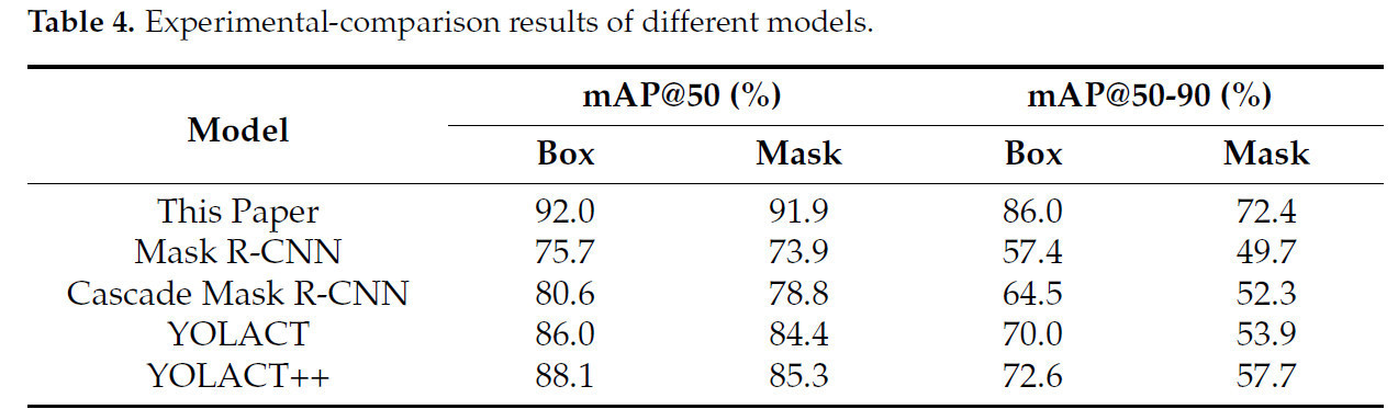 Чтобы более всесторонне оценить производительность много-морфологической модели сети сегментации чайных почек, было проведено сравнение между предложенной моделью сегментации экземпляров и другими передовыми моделями сегментации, включая Mask R-CNN [41], Cascade Mask R-CNN [42], YOLACT [43] и YOLACT++ [44]. Экспериментальные результаты представлены в Таблице 4.