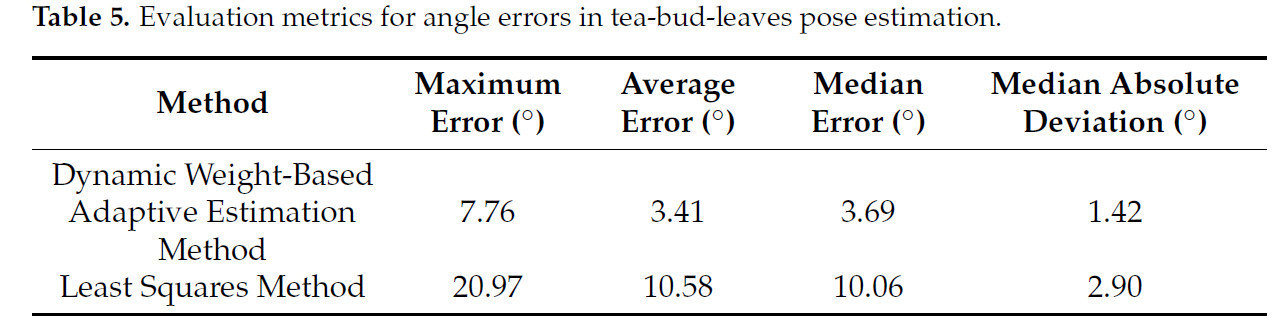 В этом разделе мы провели эксперименты, используя предложенный метод адаптивной оценки на основе динамических весов и метод наименьших квадратов для оценки позы чайных почек. Рисунок 10 и Таблица 5 отображают сравнение угловых ошибок между двумя методами. Метод адаптивной оценки на основе динамических весов, предложенный в этом исследовании, привел к максимальной ошибке 7,76° и средней ошибке 3,41°, тогда как метод наименьших квадратов дал максимальную ошибку 20,97° и среднюю ошибку 10,58°. Максимальная ошибка была снижена на 67,77%, а средняя ошибка уменьшилась на 81,53%. Эти сокращения как максимальной, так и средней ошибок эффективно демонстрируют значительное преимущество метода адаптивной оценки с динамическими весами в общей точности оценки. Более того, этот метод показывает лучшую стабильность и надежность в сложной, неструктурированной среде чайного сада. Чтобы минимизировать влияние данных-выбросов, также использовались медианная ошибка и медианное абсолютное отклонение для оценки. Метод адаптивной оценки на основе динамических весов дал медианную ошибку 3,69° и медианное абсолютное отклонение 1,42°, тогда как метод наименьших квадратов привел к медианной ошибке 10,06° и медианному абсолютному отклонению 2,90°. Эти результаты дополнительно подчеркивают высокую эффективность предложенного метода в задачах оценки позы чайных почек.
