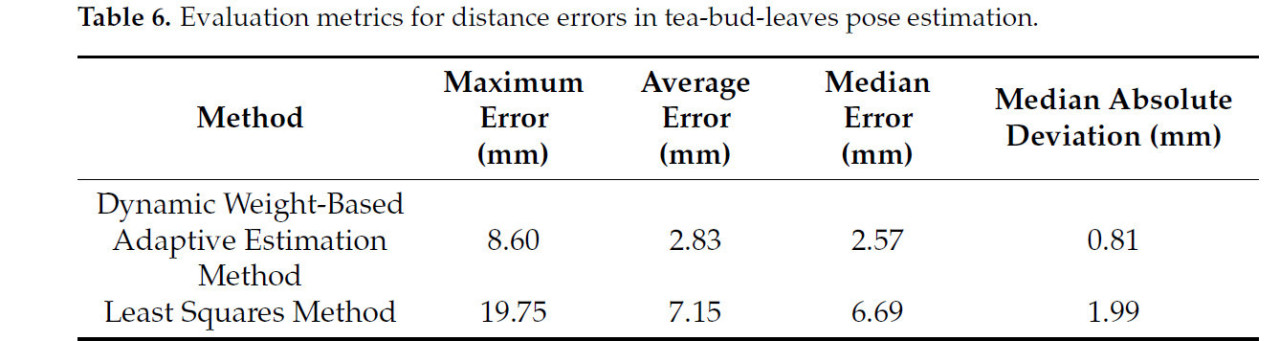 Хотя качество данных облака точек влияет на точность оценки позы, предложенный метод адаптивной оценки на основе динамических весов корректирует веса действительных облаков точек, захватывая морфологические признаки чайных почек. Это снижает вмешательство недействительных данных в оценку позы и сохраняет ошибку в разумных пределах.