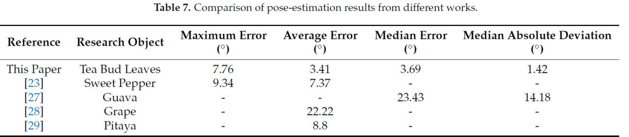 В отличие от вышеупомянутых исследований, форма чайных почек более сложна и значительно зависит от факторов окружающей среды, что делает существующие методы трудноприменимыми эффективно для оценки позы. Таблица 7 представляет результаты этих исследований. Примечательно, что эти исследования анализируют только угловую ошибку в оценке позы. По сравнению с ними, метод, предложенный в этом исследовании, предлагает значительные преимущества, в основном благодаря своей стратегии оценки динамических весов. Эта стратегия позволяет точно захватывать и количественно представлять различные морфологические признаки, проявляемые чайными почками, тем самым повышая надежность и обобщающую способность алгоритма.