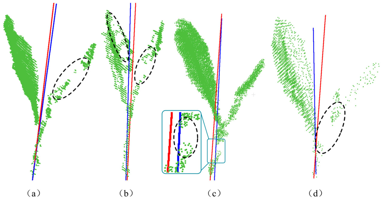 Результаты оценки позы для чайных почек с облаками точек различного качества показаны на Рисунке 12, где красная линия представляет истинную позу чайных почек, а синяя линия указывает позу, оцененную с использованием метода оценки на основе динамических весов. Когда часть облака точек чайной почки или листа отсутствует, хотя некоторая детальная информация теряется в отсутствующих областях, оставшееся облако точек все еще сохраняет основные морфологические признаки чайных почек, что приводит к относительно небольшим ошибкам оценки. Это явление проиллюстрировано на Рисунке 12a,b, указывая, что когда форма чайных почек относительно полна, влияние потери облака точек на оценку позы минимально. Однако стебель, как опорная структура чайных почек, играет ключевую роль в поддержании общей формы. Отсутствующие облака точек стебля или потеря облака точек на пересечении стебля и чайной почки значительно влияют на морфологические признаки цели, что приводит к большему влиянию на оценку позы, как показано на Рисунке 12c,d.
