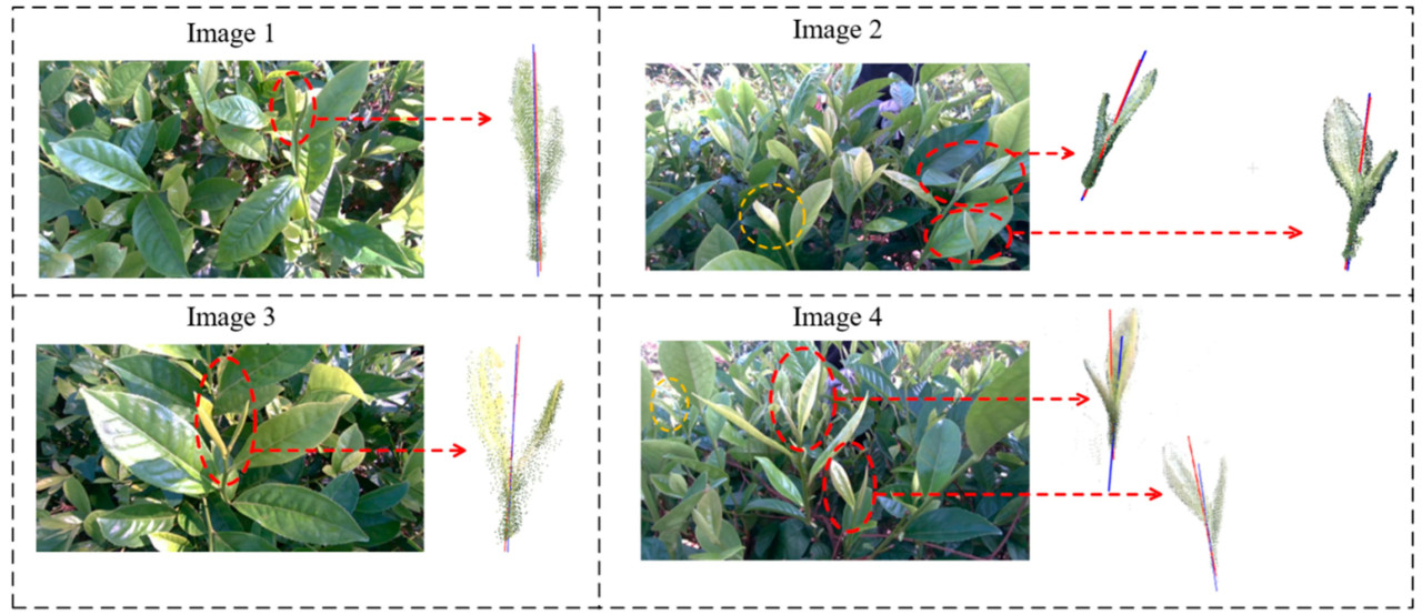 (i) Это исследование было проверено с использованием сорта чая Yinghong No. 9 и не имеет всесторонней оценки его применимости к другим сортам чая. Чайные почки и стебли Yinghong No. 9 относительно крепки, и его листья шире, с отчетливыми геометрическими признаками, предоставляя относительно четкие цели для визуального распознавания и оценки позы. Однако морфологические характеристики различных сортов чая значительно различаются, например, более узкие листья и более нежные чайные почки и стебли. Эти различия могут влиять на производительность модели визуального распознавания и точность оценки позы. Поэтому будущие исследования должны расшириться, включив распознавание и оценку позы нескольких сортов чая, особенно в решении морфологических вариаций, вызванных различными сортами чая, и сосредоточиться на улучшении адаптируемости алгоритма к этим изменениям.