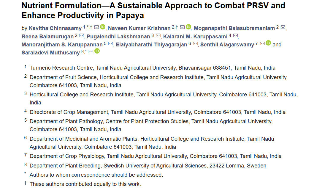 Chinnasamy K, Krishnan NK, Balasubramaniam M, Balamurugan R, Lakshmanan P, Karuppasami KM, Karuppannan MS, Thiyagarajan E, Alagarswamy S, Muthusamy S. Nutrient Formulation—A Sustainable Approach to Combat PRSV and Enhance Productivity in Papaya. Agriculture. 2025; 15(2):201. https://doi.org/10.3390/agriculture15020201
