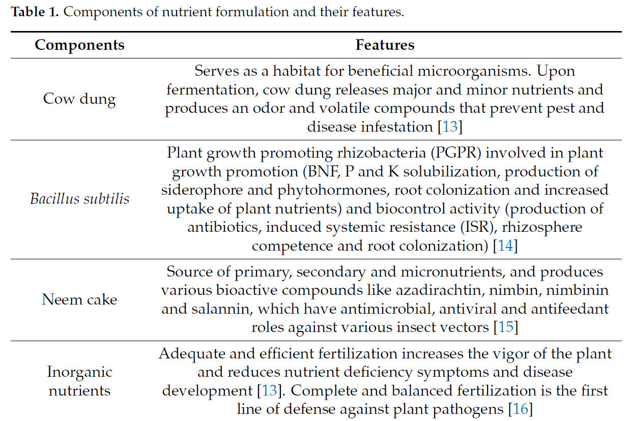 Используемые компоненты для приготовления питательного состава для папайи: свежий коровий навоз, Bacillus subtilis, нимовый жмых, сульфат калия, сульфат цинка, борная кислота, сульфат железа и нитрат кальция; их особые характеристики упомянуты в Таблице 1.